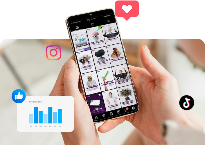 Pacotes de postagem em redes sociais, nos formatos que você precisa: cards, carrosséis, reels e stories.